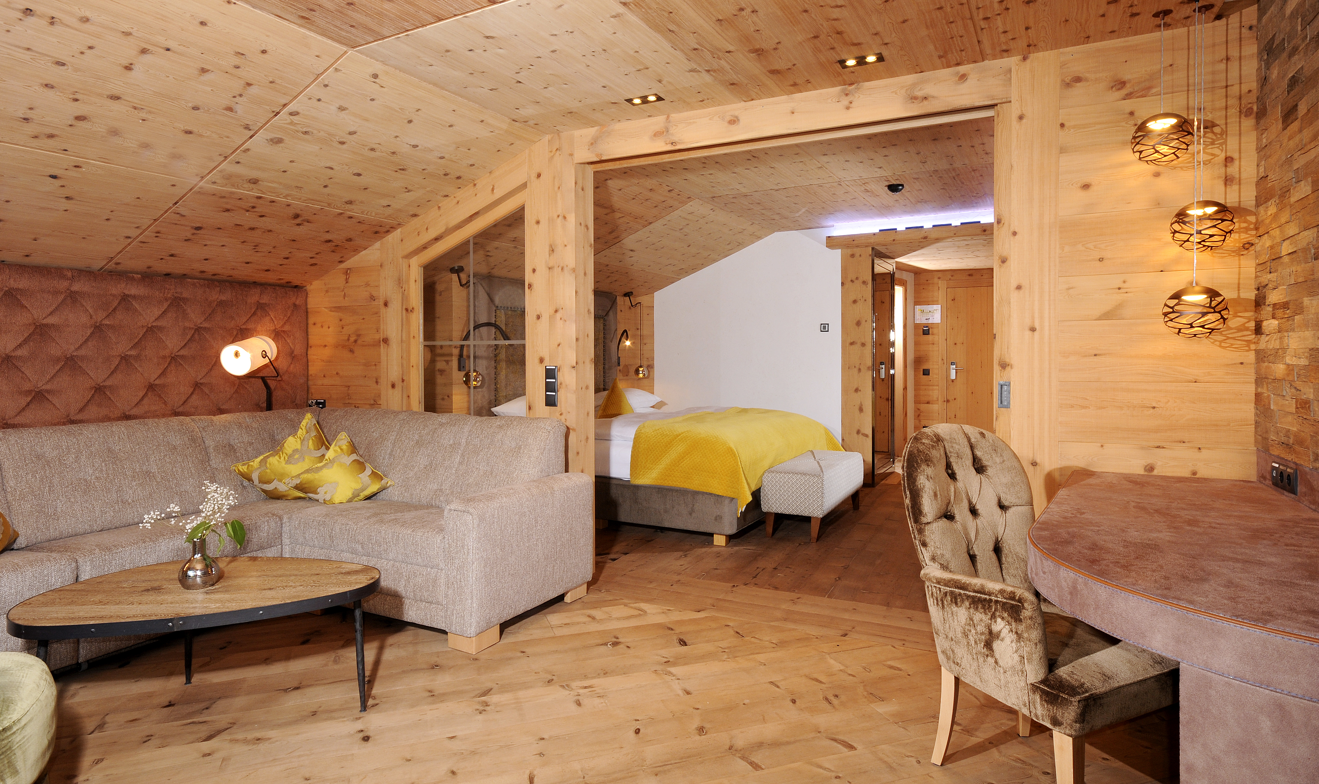 Ausgewählte Stoffe. Heimisches Holz. Materialien, die schmeicheln, und Farben, die Ruhe und Entspannung ermöglichen. Die neue Suite Sonnblick Deluxe ist eine Interpretation des modernen STOCK feelings und lädt ein, Eleganz und Gemütlichkeit auf besonders komfortable Weise zu erleben.